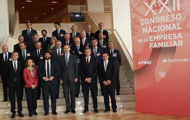 Felipe VI ha inaugurado el XXII Congreso Nacional de la Empresa Familiar que se desarrolla entre el 27 y el 29 de octubre, organizado por el Instituto de la Empresa Familiar (IEF), con la colaboración de la Asociación Murciana de la Empresa Familiar (Amefmur), y patrocinado por Banco Santander y KPMG, y al que se espera que asistan más de 500 empresarios familiares procedentes de toda España.