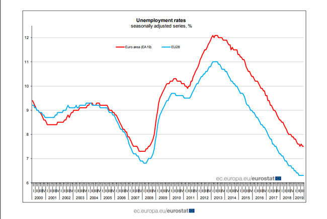 La tasa de desempleo ajustada estacionalmente de la zona del euro fue del 7,5% en septiembre de 2019, estable en comparación con agosto de 2019 y un 8% menos que en septiembre de 2018. Como señala Eurostat, esta es la tasa más baja registrada en la zona del euro desde julio de 2008.