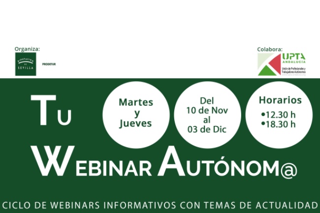 Ciclo de webinars organizado por Prodetur con la colaboración de UPTA Andalucía. Ocho sesiones informativas de entre 40 y 50 minutos de duración, encuadrados en el ciclo de webinar ‘Tu Webinar Autónom@’, en las que puedes acceder a temas que sabemos son de interés para autónomos y autónomas.