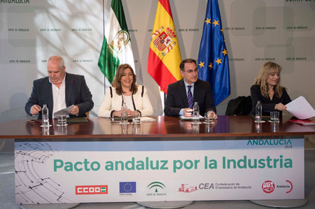 La presidenta de la Junta, Susana Díaz, ha firmado con el presidente de la Confederación de Empresarios de Andalucía (CEA), Javier González de Lara, y los secretarios generales de UGT-A y CCOO-A, Carmen Castilla y Francisco Carbonero, el Pacto Andaluz por la Industria, que tiene entre sus objetivos la movilización de 8.000 millones de euros y la recuperación de los niveles de empleo en este sector previos a la crisis.