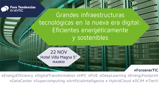 La Plataforma enerTIC organiza, el próximo 22 de noviembre en el Hotel Villa Magna 5* en Madrid, el Foro Tendencias Tecnológicas: “Grandes infraestructuras tecnológicas en la nueva era digital: Eficientes energéticamente y sostenibles” en las que organizaciones a la vanguardia tecnológica en sus respectivos sectores, y la propia industria IT, analizarán cómo el cambio hacia el modelo de servicios digitales está impactando en el desarrollo de grandes infraestructuras tecnológicas y de las oportunidades de mejorar su eficiencia energética con tecnologías de nueva generación y buenas prácticas.